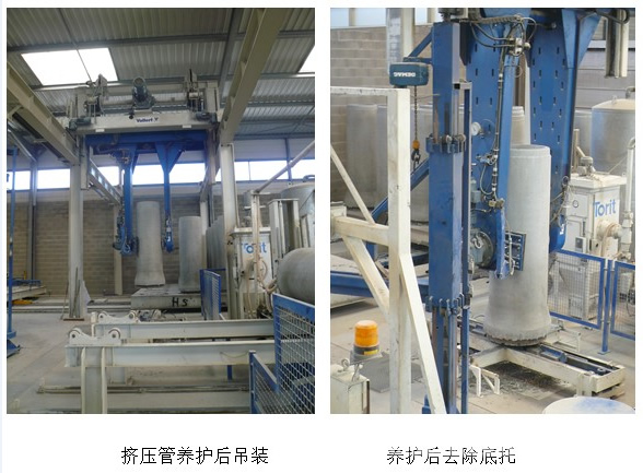 擠壓管完成后,完成的管模由專用出管機械手吊起,沿軌道運行到養(yǎng)護窯的搬運小車頂部,機械手和小車的行走控制系統(tǒng)共同將擠壓管按一定的順序擺放好,出管機械手將管模打開并垂直吊起脫模,將空管模帶回管機外站重新組裝。車廂上的擠壓管出料后緩緩移動到固化窯內(nèi),下一節(jié)車廂運行到工作位置繼續(xù)作業(yè)。小車載著擠壓管在養(yǎng)護窯內(nèi)逐段運行至出窯口,小車運行控制系統(tǒng)和溫控系統(tǒng)完成對擠壓管的靜止、溫度、保溫、冷卻和濕度控制等各方面的維護,養(yǎng)護窯兩端的門加簾子用于保溫。最后,小車停在擠壓管的卸料位置,翻料機械手將小車上的每根管子逐一拾起,先取下底托板,然后將管子吊起并翻轉(zhuǎn)90度,沿軌道走到出口軌道,擠壓管在這里進行與自動生產(chǎn)線模式下的吊裝操作一樣的后處理。底部托盤經(jīng)過處理后運回管機,裝配到模具中,進行下一個生產(chǎn)周期。